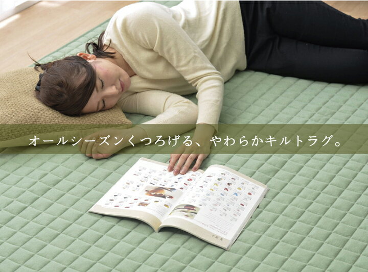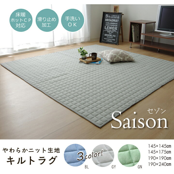 ラグ 長方形 3畳 年間使えるふんわりニット生地のキルティングラグ約190×240cm ブルー・グリーン・グレーラグマット キルトラグ カーペット ホットカーペット対応 電気カーペット対応 北欧 シンプル おしゃれ リビング【9810074】セゾン